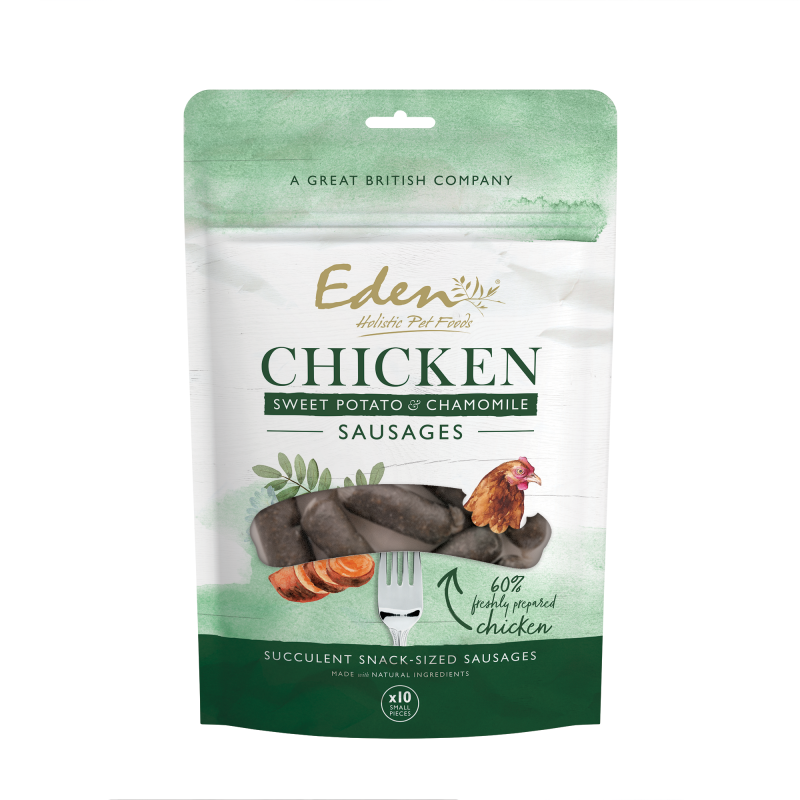 Edens Succulent Chicken, Sweet Potato & Chamomile Sausages are inspired by our favourite aspects of our food ranges, taking the soft and squidgy texture of our Succulent Semi-Moist Range and combining this with the bistro ingredients and luxury flavour of our Gourmet Range. Boasting a 60% meat content with the addition of beautiful fruit, vegetables and botanicals making them completely irresistible to your dog.