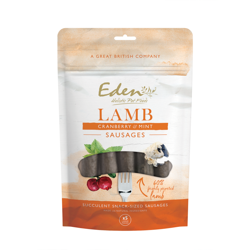 Edens Succulent Lamb, Cranberry & Mint Sausages are inspired by our favourite aspects of our food ranges, taking the soft and squidgy texture of our Succulent Semi-Moist Range and combining this with the bistro ingredients and luxury flavour of our Gourmet Range. Boasting a 60% meat content with the addition of beautiful fruit, vegetables and botanicals making them completely irresistible to your dog.
