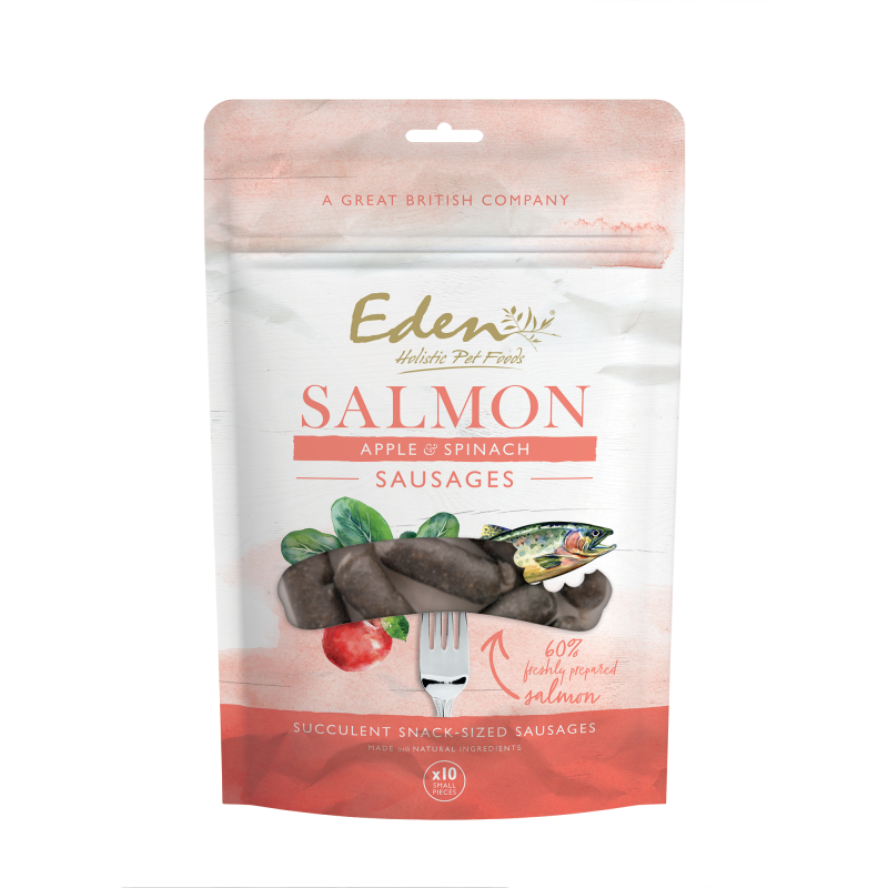 Edens Succulent Salmon, Apple & Spinach Sausages are inspired by our favourite aspects of our food ranges, taking the soft and squidgy texture of our Succulent Semi-Moist Range and combining this with the bistro ingredients and luxury flavour of our Gourmet Range. Boasting a 60% meat content with the addition of beautiful fruit, vegetables and botanicals making them completely irresistible to your dog.