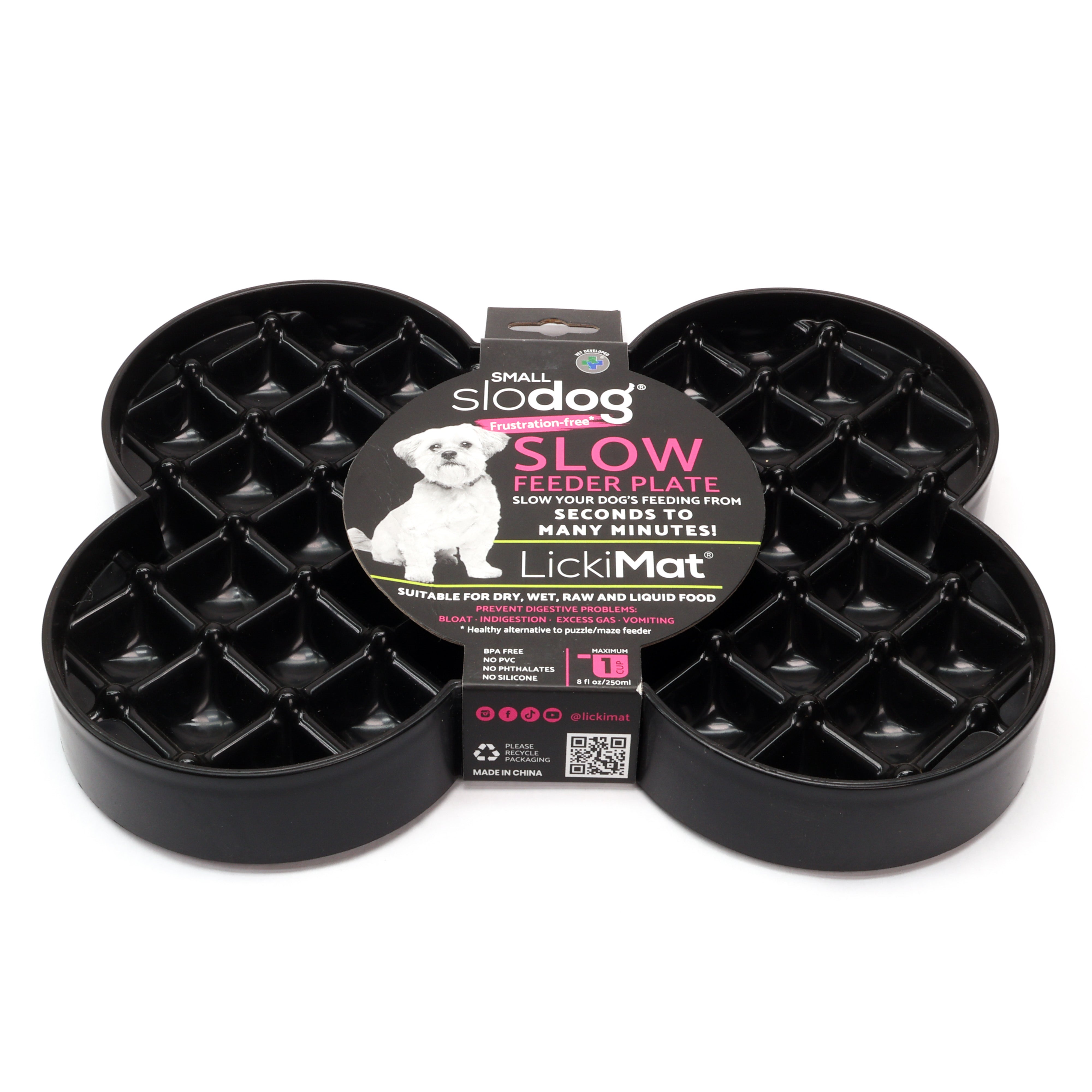 Slodog® is a unique approach to slow feeding or anti-gulping. By changing from a bowl to a plate, a much larger surface area becomes available to the feeding dog. All the food is in plain sight and does not have to be chased, this avoiding frustration.